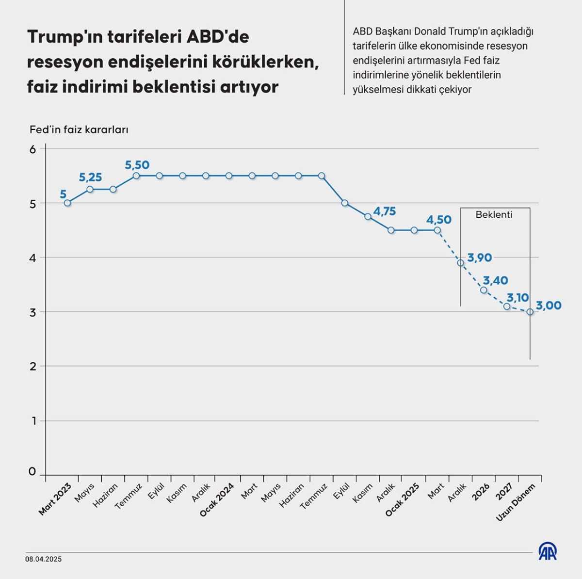 ABD Başkanı Trump’ın açıkladığı tarifelerin, ülke ekonomisinde resesyon endişelerini artırmasıyla birlikte, Fed’in faiz indirimlerine yönelik beklentilerin de yükseldiği dikkati çekiyor.