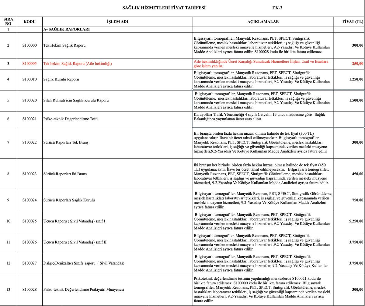 Fiyat Tarifesi’nde de “Tek hekim Sağlık Raporu (Aile hekimliği): Aile hekimlikliğinde Ücret Karşılığı Sunulacak Hizmetlere İlişkin Usul ve Esaslara göre işlem yapılır.” denilerek, bu hizmetin karşılığı olarak da 250 lira talep edileceği belirtildi.