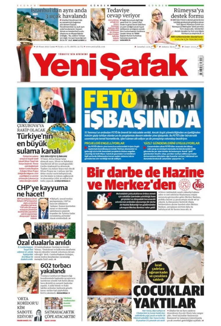 Diğer yandan Yenişafak gazetesinin de manşete aldığı faiz kararına ”Bir darbe de Hazine ve Merkez’den” başlığını attığı görüldü. Kararın ‘darbe’ olarak nitelendirildiği haberde ”Muhalefetin yolsuzluklarını örtbas etmek için sokaklar üzerinden yürüttüğü kaos girişimleri ve dünyadaki korumacılık adımlarının ardından ekonomiye bir darbe de Hazine Bakanlığı’nın güdümünden çıkmayan Merkez Bankası’ndan geldi” ifadeleri kullanıldı.