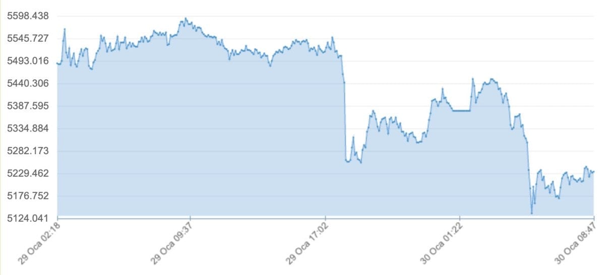 Ons altın, dünkü 5 bin 592 seviyesinden önce 5 bin 113 dolara geriledi. Şu anda 5 bin 222 dolarda ve dünkü seviyesinin hala altında.