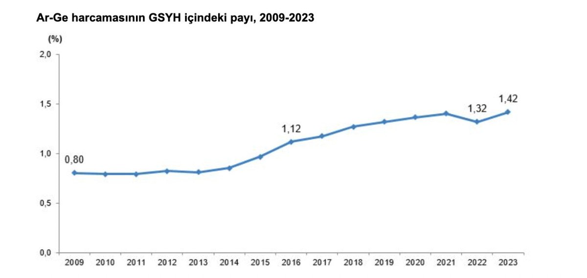 Gayrisafi yurt içi AR-GE harcamasının GSYH içindeki oranı 2022’de yüzde 1,32 iken, 2023’te 26 trilyon 545 milyar 722 milyon liralık GSYH içindeki oranı yüzde 1,42 oldu.