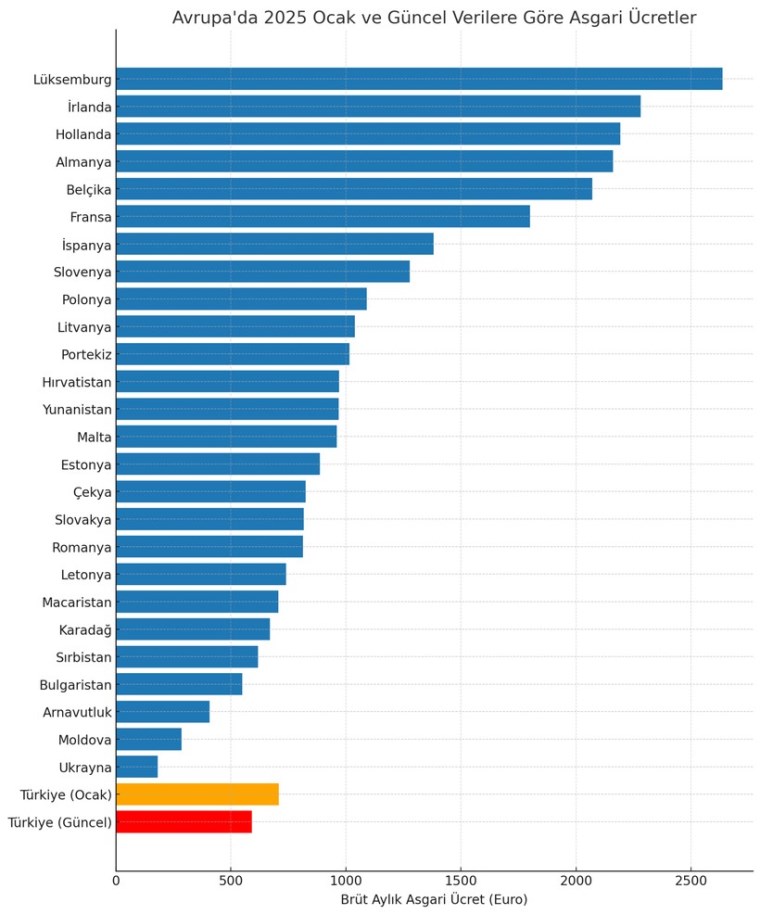 Eurostat verilerine göre, 2025 yılı başında Türkiye’deki brüt asgari ücret 26 bin 5 TL olarak belirlenmişti ve o dönemde döviz kuru 36,73 TL idi. Bu hesaplamayla Türkiye’deki brüt asgari ücret yaklaşık 708 Euro seviyesindeydi. Ancak son aylarda döviz kurundaki sert artış nedeniyle bu rakam önemli ölçüde düştü. Euro/TL kurunun 44 seviyelerine ulaşmasıyla, asgari ücretin Euro karşılığı yaklaşık 591 Euro’ya geriledi.