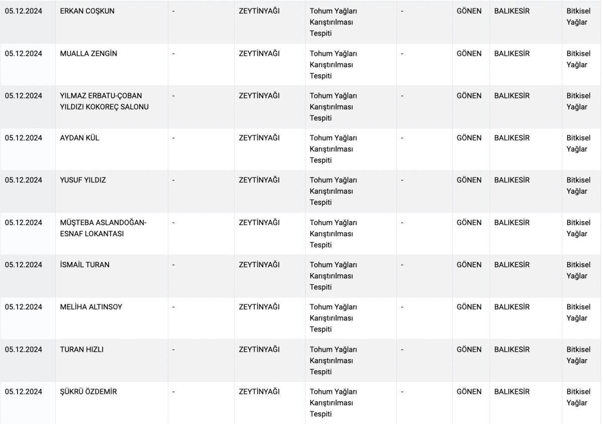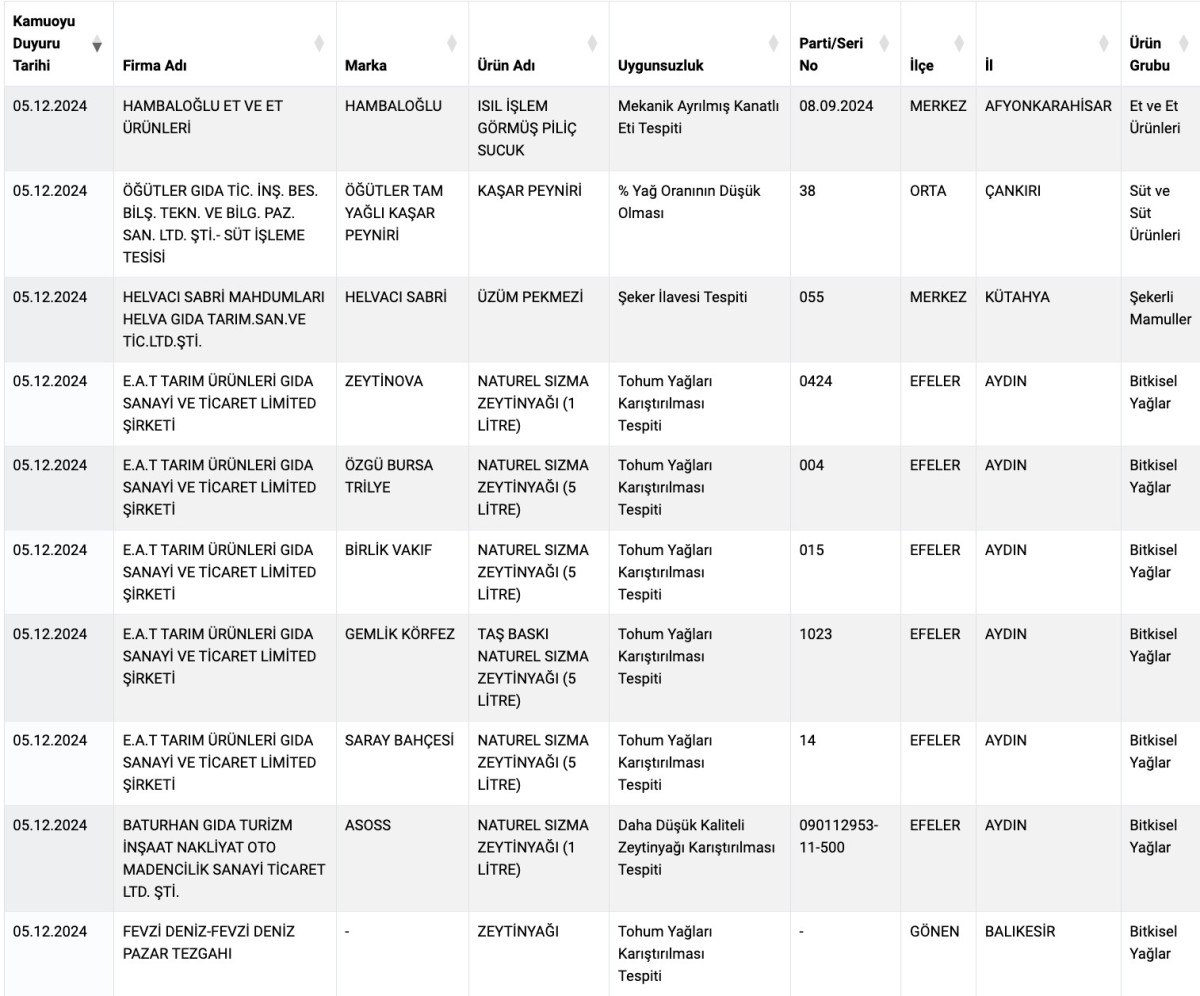 Listede bulunan ürünlerde, kanatlı eti, sakatat ve tek tırnaklı tespiti ile taklit, tağşiş ve bitkisel yağ tespiti gibi birçok uygunsuzluk yer alıyor.