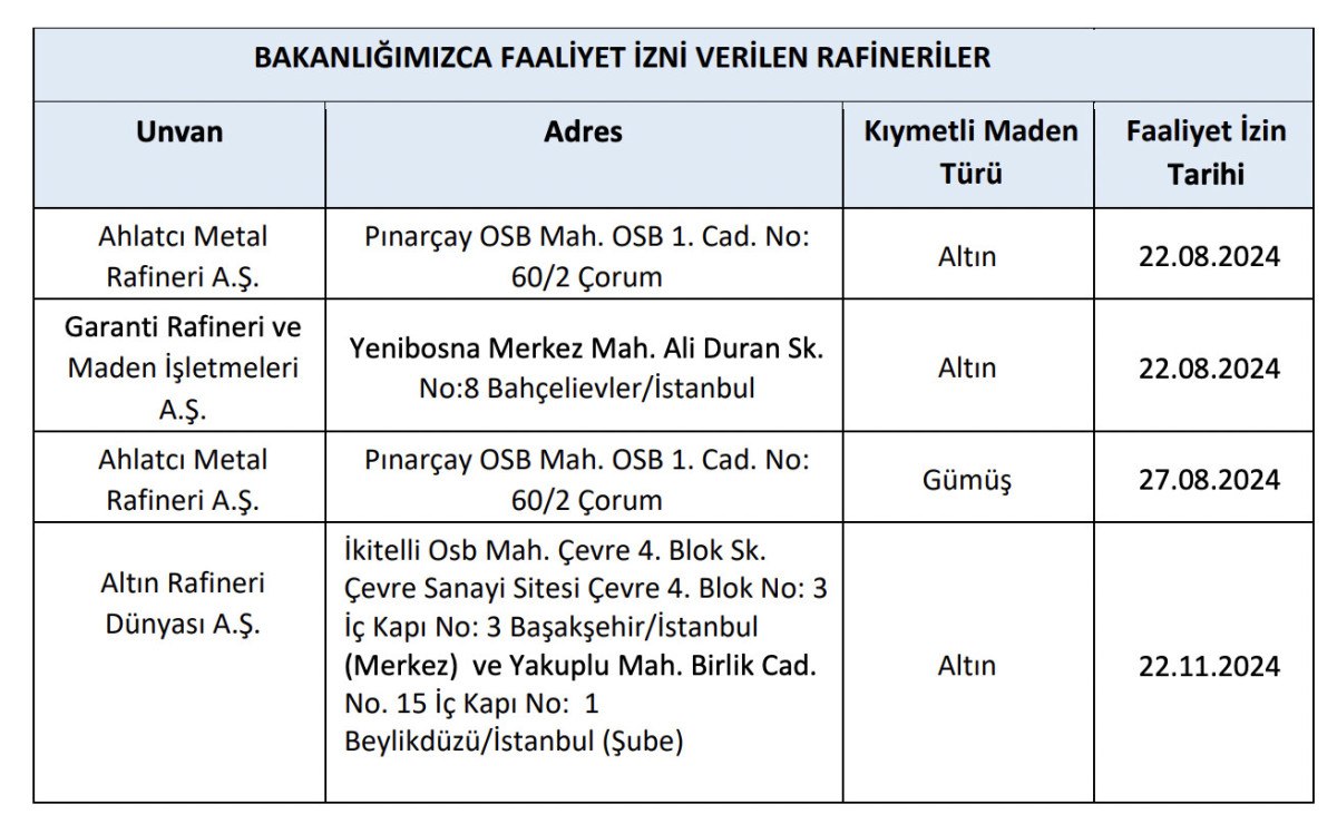 Bu kapsamda, Ahlatcı Metal Rafineri AŞ‘ye altın ve gümüş, Garanti Rafineri ve Maden İşletmeleri AŞ ile Altın Rafineri Dünyası AŞ‘ye de altın için faaliyet izni verildi.