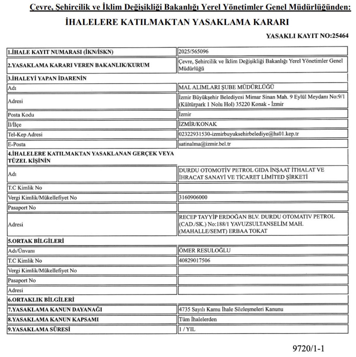 Çevre, Şehircilik ve İklim Değişikliği Bakanlığı Yerel Yönetimler Genel Müdürlüğü’nden İhalelere Katılmaktan Yasaklama Kararı verilen ihaleyi yapan belediyeler ve ihalelere katılmaktan yasaklanan gerçek ve tüzel kişilere ait bilgiler Resmi Gazete’de yayımlandı.