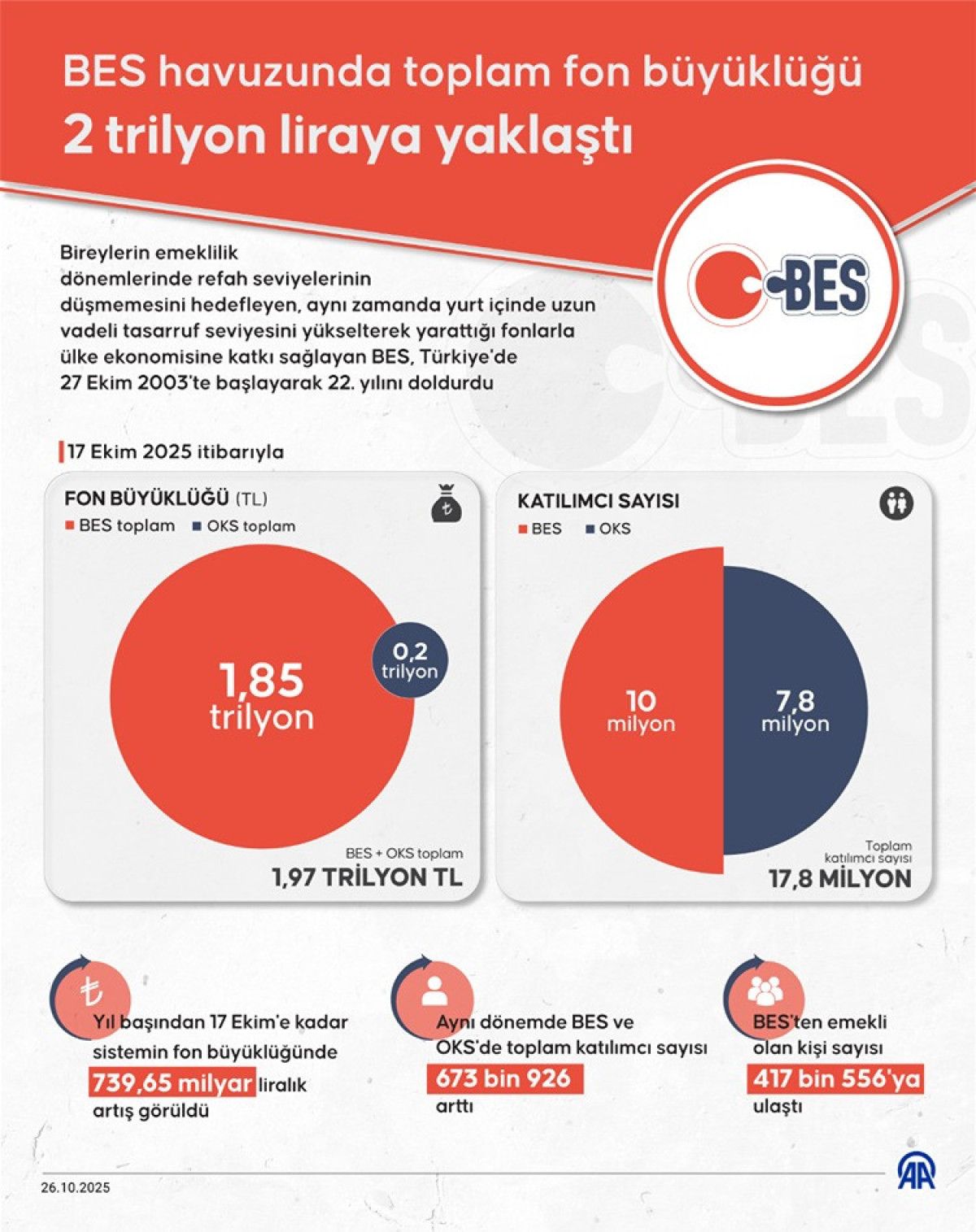 Böylece BES ve OKS’deki katılımcıların fon tutarında, devlet katkısı fon tutarları da dikkate alındığında 2024 yıl sonundan 17 Ekim 2025’e kadar 739 milyar 654,3 milyon liralık artış görüldü. Aynı dönemde BES ve OKS’de toplam katılımcı sayısı 673 bin 926 arttı.