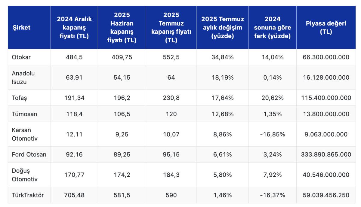 Temmuzda Borsa İstanbul’da işlem gören 8 otomotiv şirketinin tamamı yatırımcısına kazandırdı. Geçen ay Borsa İstanbul’da Otokar, yüzde 34,8 ile hisseleri en çok değerlenen otomotiv şirketi oldu. Otokar’ı yüzde 18,2’lik yükselişle Anadolu Isuzu, yüzde 17,6’lık artışla Tofaş izledi.