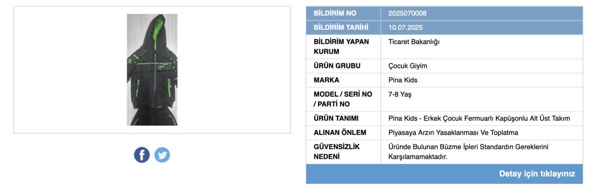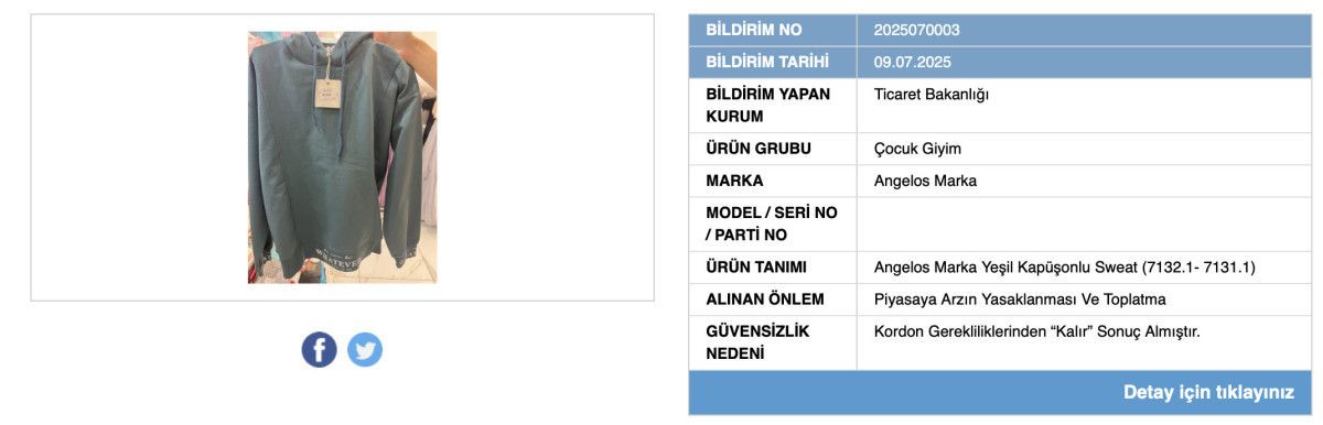 Güvensiz Ürün Bilgi Sistemi’nde yayımlanan bilgilere göre, Angelos marka yeşil kapüşonlu sweat ile Pina Kids marka erkek çocuk fermuarlı kapüşonlu alt-üst takım ürünlerinde güvensizlik unsurları tespit edildi.