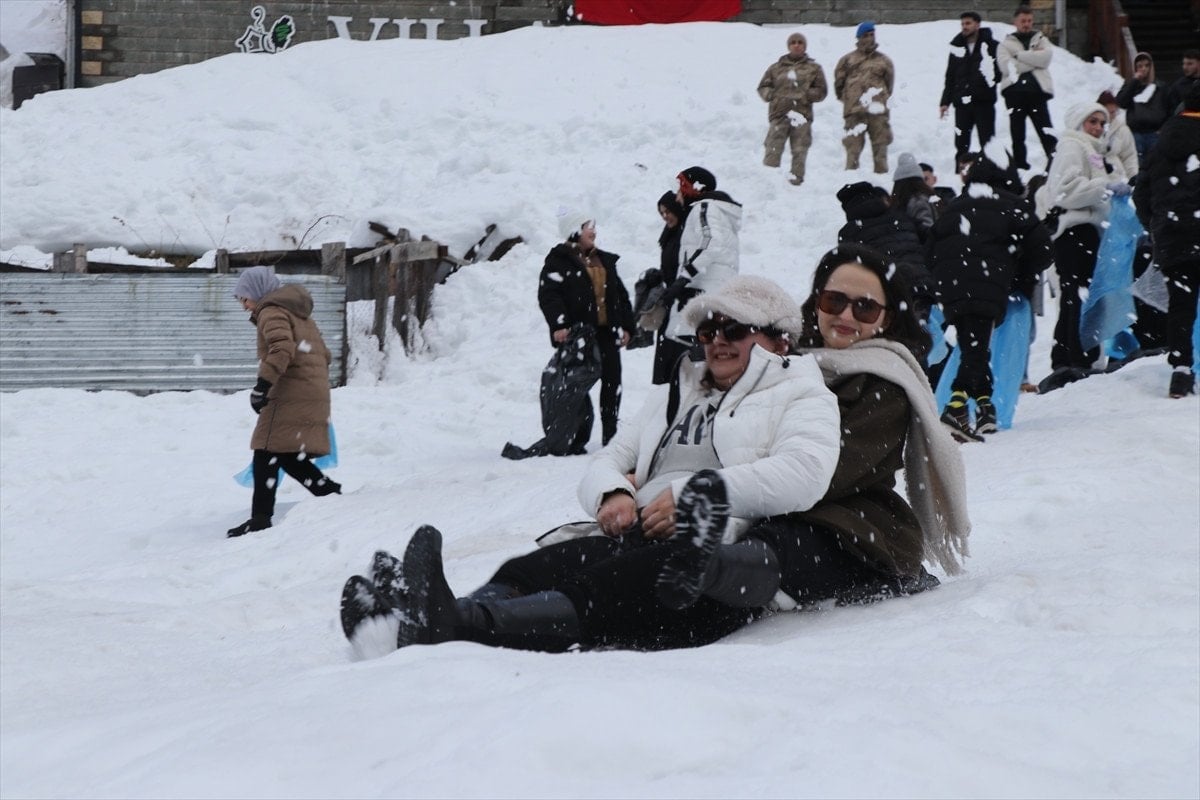 Kar üzerinde tulum ve kemençe eşliğinde kurulan dev horon halkalarının yanı sıra halat çekme, ok atma, çocuklar için animasyon etkinlikleri düzenlenirken, bazı vatandaşlar da poşetlerle kaymanın keyfini çıkardı.