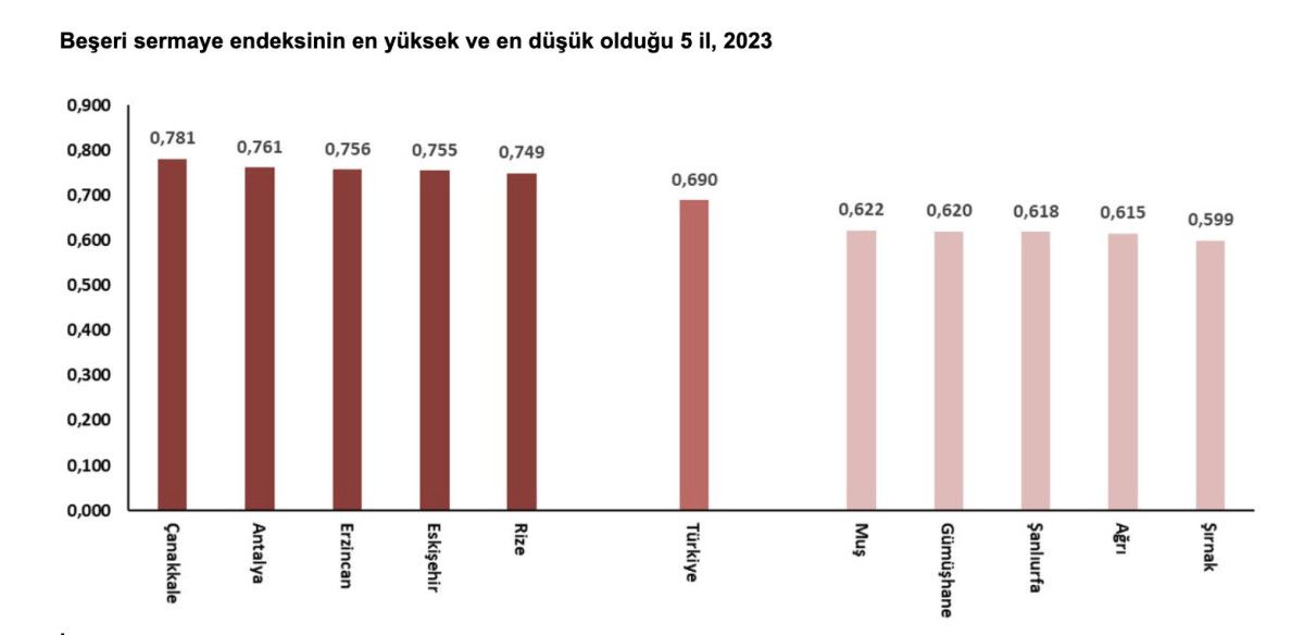 Beşeri sermaye endeksinin 2021-2023 yılları arasında en çok artış gösterdiği ilk beş il sırasıyla 0,026 puan ile Çanakkale, 0,022 puan ile Uşak ve 0,017 puan ile aynı değer artışına sahip Siirt, Antalya, Erzincan oldu.