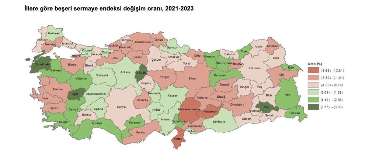 Aynı dönemde, beşeri sermaye endeksinin düşüş gösterdiği iller sırasıyla 0,066 puan azalış ile Hatay, 0,059 puan azalış ile Adıyaman, 0,048 puan azalış ile Kahramanmaraş, 0,024 puan azalış ile Manisa ve 0,022 puan azalış ile Malatya oldu.