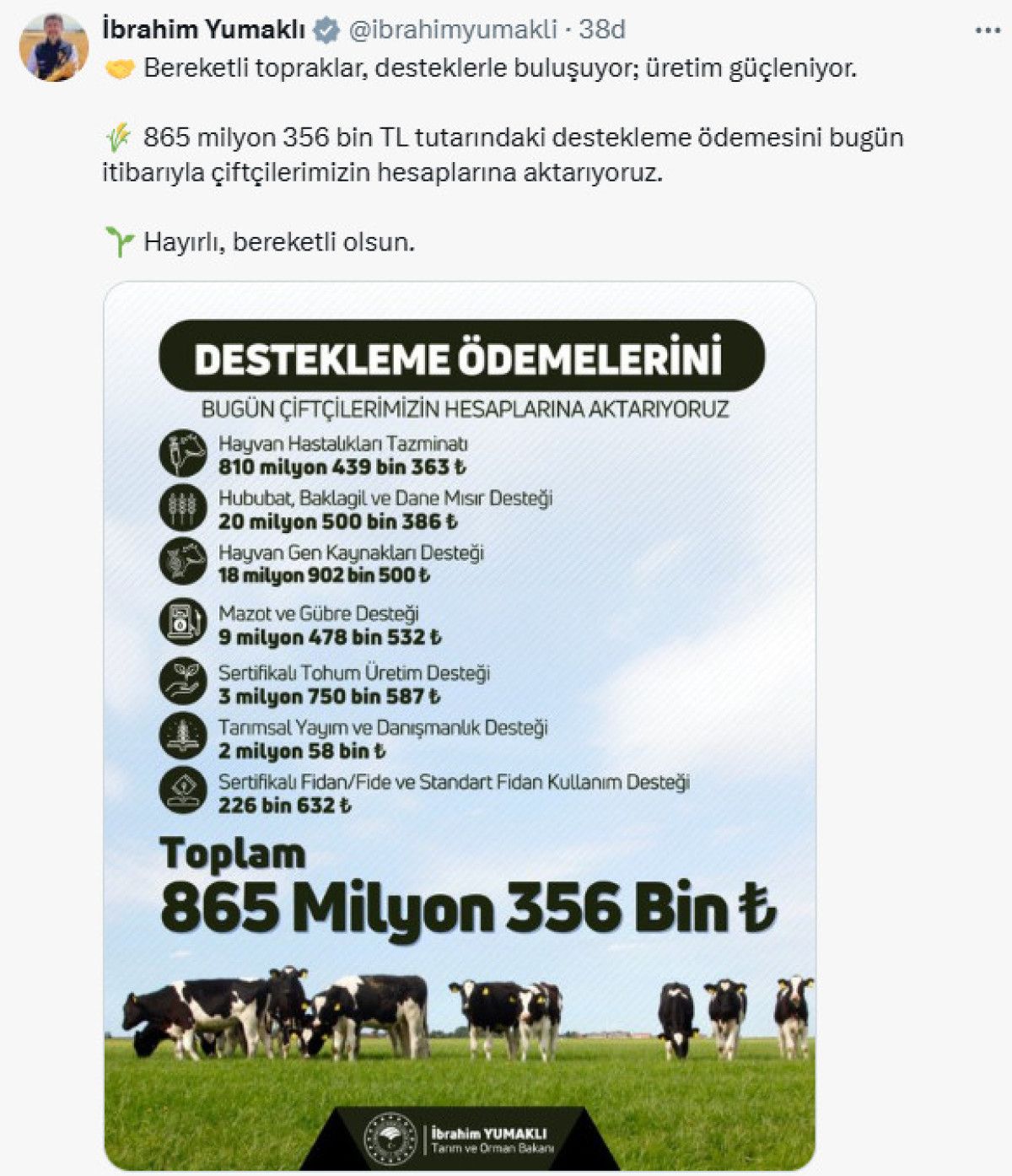 Tarım ve Orman Bakanı Yumaklı, sosyal medya hesabından yaptığı paylaşımda, son destekleme ödemelerine ilişkin bilgi verdi.