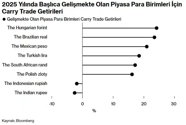 Carry trade stratejileri, düşük maliyetle borçlanılan para birimleriyle daha yüksek faiz sunan para birimlerinin satın alınmasına dayanıyor. Bu işlemler yalnızca kur performansından değil, gelişen ülkelerdeki yüksek reel faiz oranlarından da destek buluyor. Enflasyondaki yavaşlamaya rağmen birçok gelişen ülke merkez bankası para politikasında temkinli bir gevşeme sürecini sürdürüyor.
