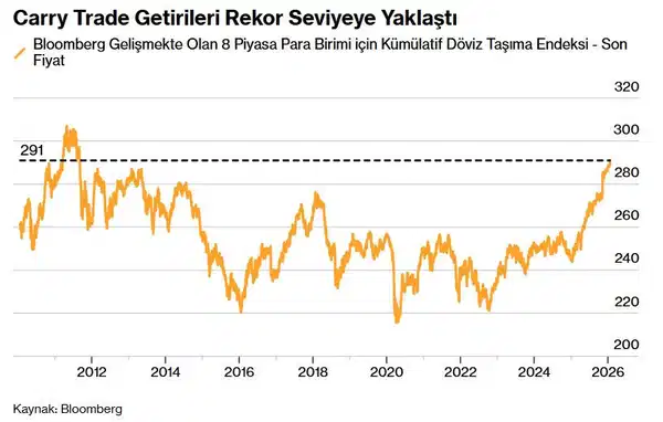 Carry trade endeksi, son işlem gününde 291 seviyesinin üzerine çıkarak 2011 yılında görülen rekor seviyenin yaklaşık yüzde 5 altında işlem gördü. Güney Afrika randı ve Kolombiya pesosu gibi para birimleri de çok yıllı zirvelerine yakın seyrediyor.