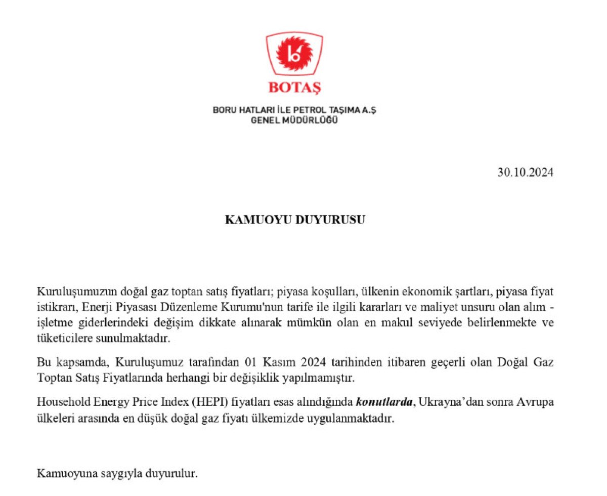 Bu kapsamda, Kuruluşumuz tarafından 01 Kasım 2024 tarihinden itibaren geçerli olan Doğalgaz Toptan Satış Fiyatlarında herhangi bir değişiklik yapılmamıştır.