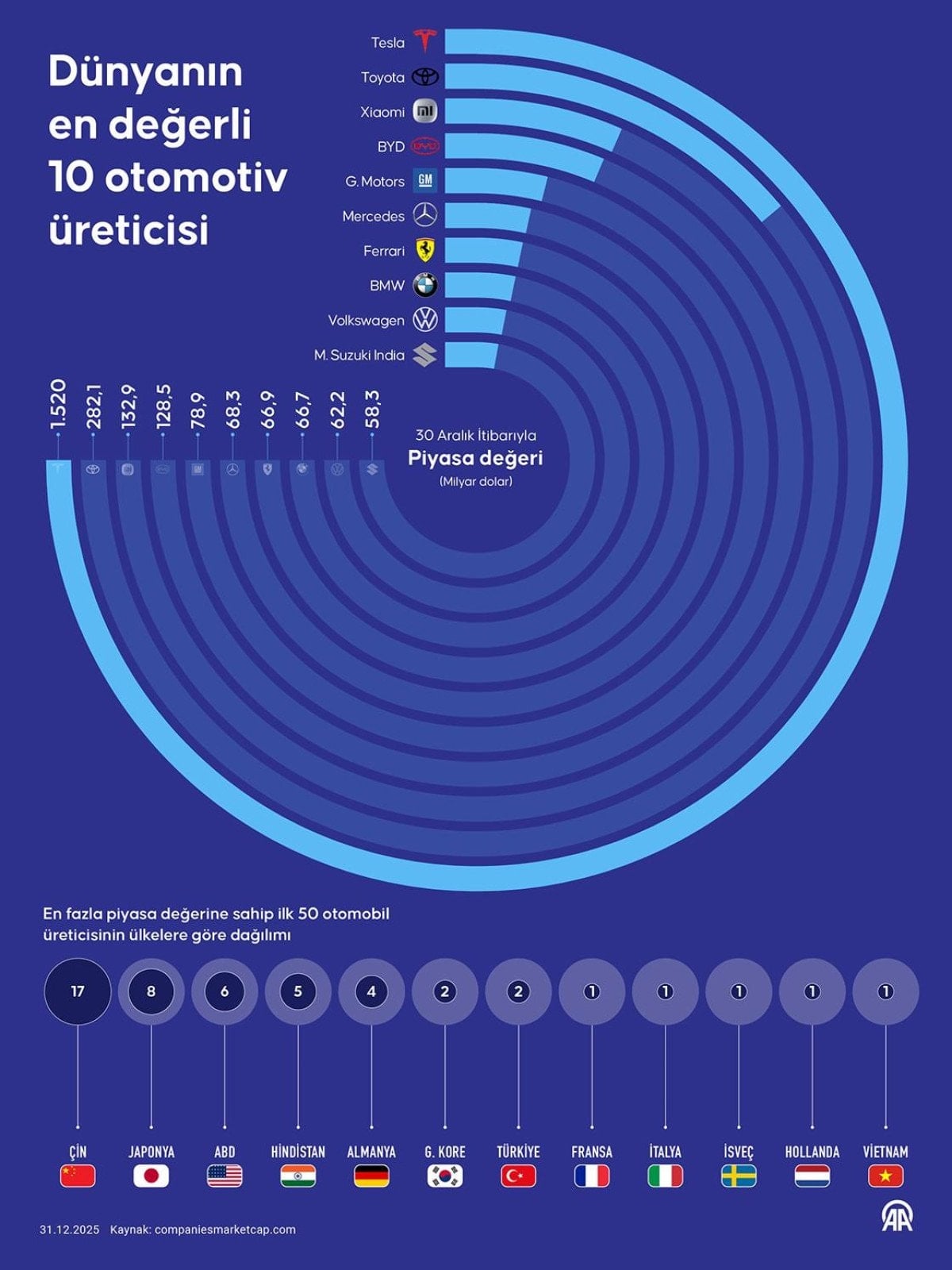 En fazla piyasa değerine sahip ilk 50 otomobil üreticisinin ülkelere göre dağılımına bakındığında 30 Aralık itibarıyla hazırlanan sıralamada Tesla’nın, 1,1 trilyon doları aşan piyasa değeriyle lider olduğu görülüyor.