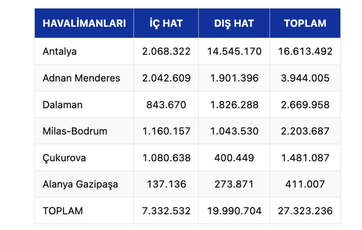 Birçok ülkeden dış hat uçuşlarının olduğu, aynı zamanda yerli turistlerin de sıklıkla kullandığı Antalya, Adnan Menderes, Milas-Bodrum, Dalaman, Çukurova ve Alanya Gazipaşa havalimanları, yaz dönemini kapsayan 3 aylık dönemde toplam 27 milyon 323 bin 236 yolcu ağırladı.