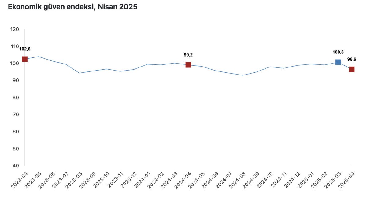 Buna göre, ekonomik güven endeksi, nisanda aylık bazda yüzde 4,2 azalışla 96,6 değerini aldı.