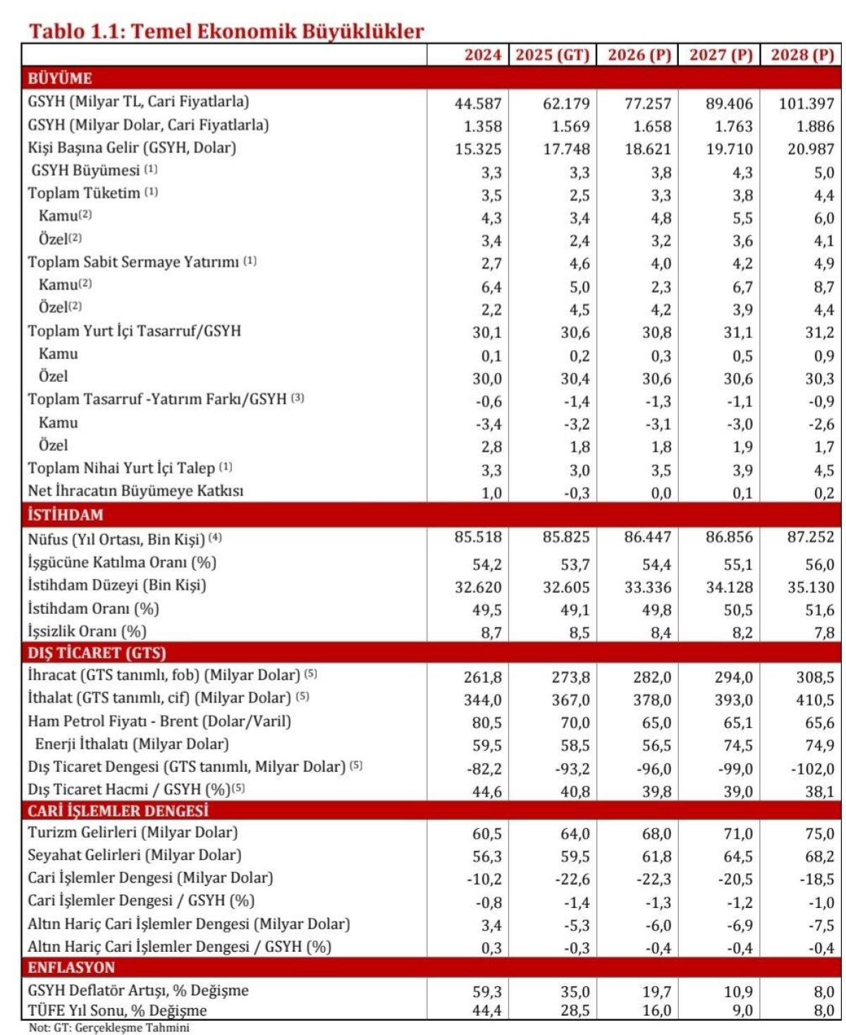 Enflasyonun bu yıl sonunda yüzde 28,5 olacağı tahmin edilirken, enflasyon hedefi gelecek yıl için yüzde 16, 2027 için yüzde 9, 2028 için yüzde 8 olarak belirlendi.