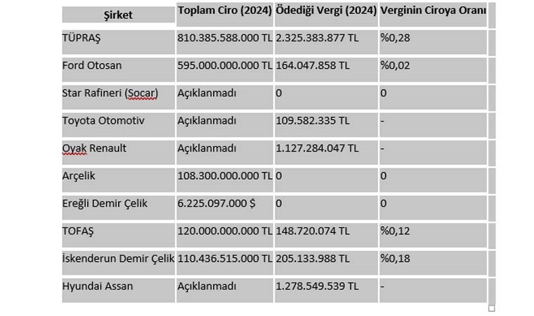 Zengin, Türkiye’de üretim yapan en büyük 10 sanayi şirketinin 2024 yılı itibarıyla ya çok düşük kurumlar vergisi ödediğini ya da hiç vergi ödemediğini aktardı. Bu şirketler; TÜPRAŞ, Ford Otosan, Star Rafineri (Socar), Toyota, Oyak Renault, Arçelik, Ereğli Demir Çelik, TOFAŞ, İskenderun Demir Çelik ve Hyundai Assan.