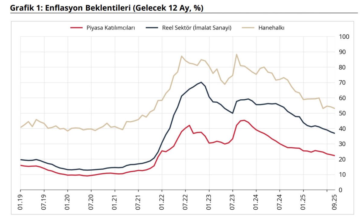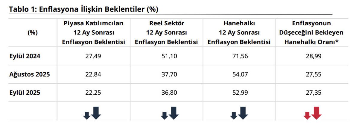 2025 yılı Eylül ayında 12 ay sonrası yıllık enflasyon beklentileri bir önceki aya göre, piyasa katılımcıları için 0,59 puan azalarak yüzde 22,25 seviyesine, reel sektör için 0,90 puan azalarak yüzde 36,80 seviyesine, hanehalkı için 1,08 puan azalarak yüzde 52,99 seviyesine geriledi.