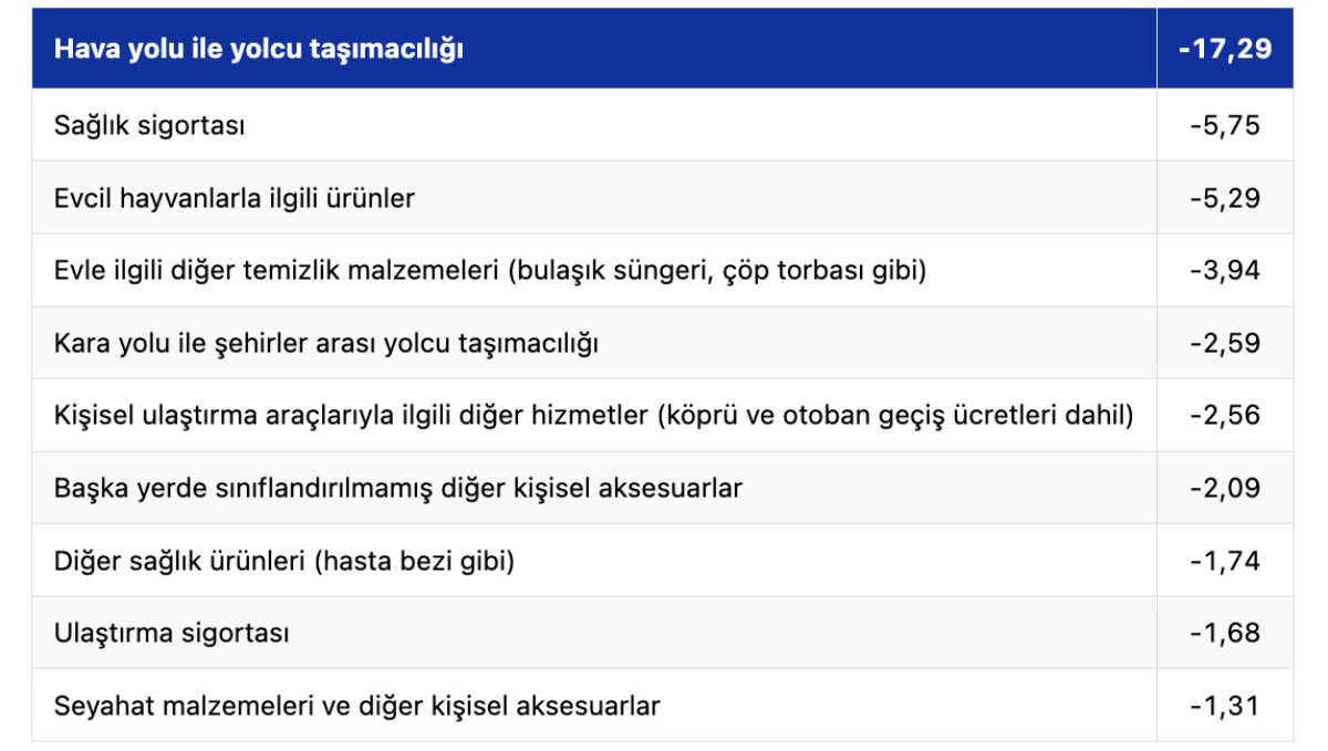 Bunu yüzde 5,75 ile sağlık sigortası, yüzde 5,29 ile evcil hayvanlarla ilgili ürünler, yüzde 3,94 ile evle ilgili diğer temizlik malzemeleri (bulaşık süngeri, çöp torbası gibi), yüzde 2,59 ile kara yoluyla şehirler arası yolcu taşımacılığı takip etti.