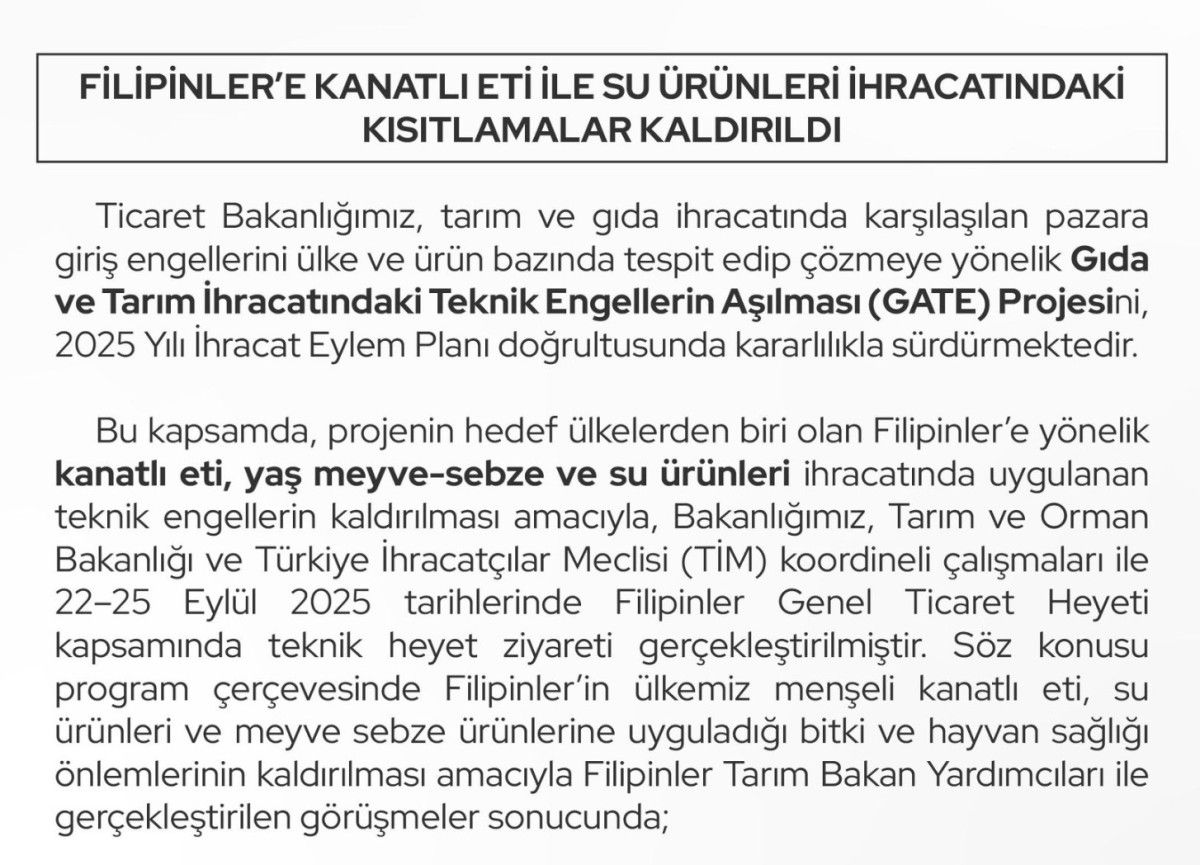 Filipinlilere kanatlı eti ile su ürünleri ihracatındaki kısıtlamalar kalktı