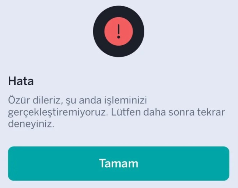 Uygulamaya giriş yapmaya çalışan kullanıcılar, “Özür dileriz, şu anda işleminizi gerçekleştiremiyoruz. Lütfen daha sonra tekrar deneyiniz” ve “Cihaz eşleşmesi kaldırılmıştır. Uygulamanıza tekrar giriş yaparak kullanmaya devam edebilirsiniz” gibi hata mesajlarıyla karşılaşıyor.
