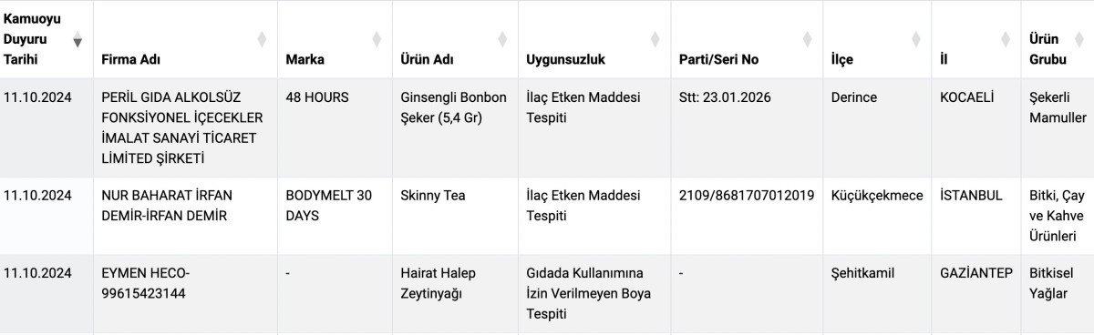 Bakanlık, yaptığı kontroller sonucunda sahip olduğu bilgileri, kamuoyunun bilgisine sunmayı sürdürüyor. Listeye yeni eklenen sakıncalı ürünlere ödem attıran çay, zeytinyağı ve bonbon şeker de eklendi.