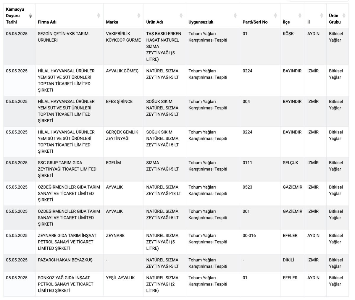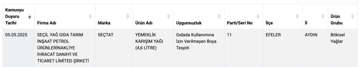 Aydın ilinin Efeler ilçesinde faaliyet gösteren Seçil Yağ Gıda Tarım İnşaat Petrol Ürünleri Nakliye İhracat Sanayi ve Ticaret Limited Şirketi, Seçtat markalı yemeklik karışım yağa (4,6 litre), gıdada kullanımına izin verilmeyen boya tespit edildi.