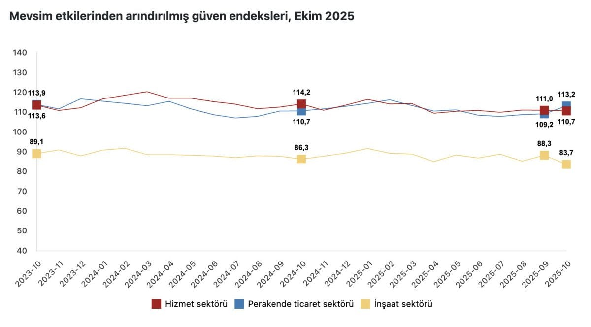 Buna göre, mevsim etkilerinden arındırılmış güven endeksi ekimde aylık bazda hizmet sektöründe yüzde 0,3 azalarak 110,7, inşaat sektöründe yüzde 5,3 azalışla 83,7 ve perakende ticaret sektöründe yüzde 3,7 artarak 113,2 değerini aldı.