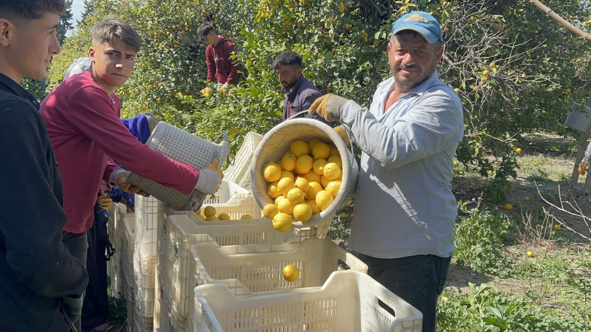 Arazimiz 40 dönüm, sabah saat 07.00’de hasada başlayıp öğlen saat 12.00-13.00 gibi bitiriyoruz. 40 dönüm araziden 15-16 ton limon hasat ediyoruz. Marketlerde limon satışı 25 TL tarlada ise 15 TL’den satılıyor.