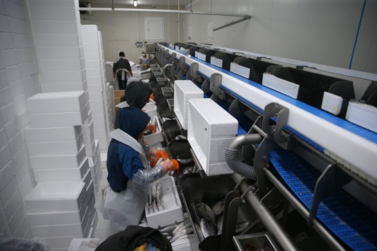 Açıktaki kafeslerde büyütüldükten sonra kıyıdaki tesise taşınan balıklar, kadınlar tarafından temizlenip uygun saklama koşullarında paketleniyor.