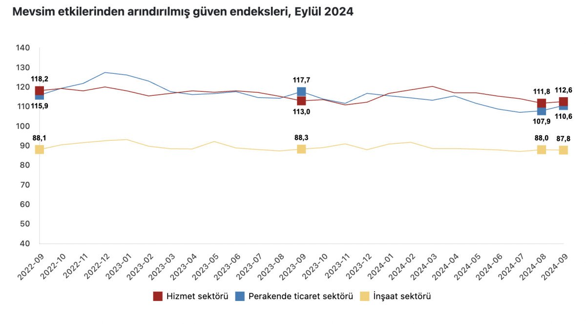 Mevsim etkilerinden arındırılmış güven endeksi eylül ayında bir önceki aya göre; hizmet sektöründe yüzde 0,6 oranında artarak 112,6 değerini, perakende ticaret sektöründe yüzde 2,5 oranında artarak 110,6 değerini ve inşaat sektöründe yüzde 0,2 oranında azalarak 87,8 değerini aldı.