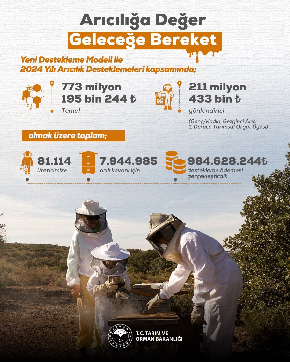 Verdikleri desteklerle arıcılık sektörünün güçlendiğini, üreticinin kazandığını vurgulayan Yumaklı, “Yeni destekleme modelimizle 2024 yılında 81 bin 114 üreticimize 7 milyon 944 bin 985 arılı kovan için 984 milyon 628 bin 244 lira destekleme ödemesi yaptık. Hem üretim kapasitesini hem de üreticimizin gelirini artırıyoruz. Türkiye Yüzyılı’nda üreticimizin daima yanındayız.” ifadelerini kullandı.