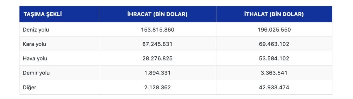 TÜİK’in 2025’e ilişkin taşıma şekillerine göre ihracat ve ithalat verileri şöyle: