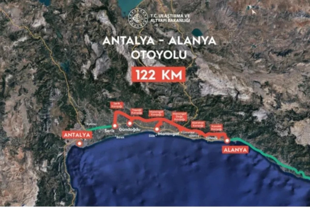 Otoyolla karbon emisyonunu 47 bin ton azaltmış olacağız. Otoyolumuz Serik Kavşağı’ndan başlayacak, daha sonra doğuya yönelerek Serik ve Manavgat ilçeleri sınırları içinde Toros Dağları’nın eteklerindeki koridoru takip ederek Konaklı’nın kuzeyinde Alanya Batı Kavşağı’nda sonlanacak. Proje içinde 7 kavşak, toplam 11 bin 300 metre uzunluğunda 8 tünel 7 bin 30 metrelik 19 viyadük ve 4 otoyol hizmet tesisi bulunacak.