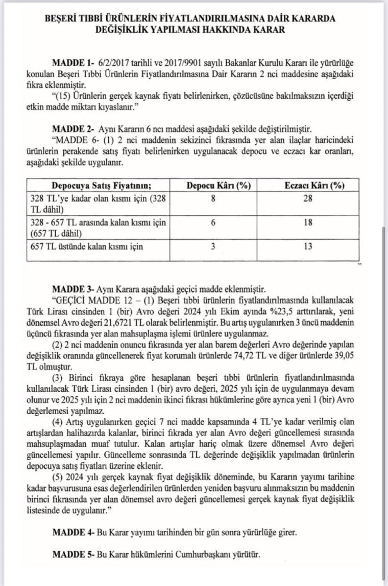 Resmi Gazete’de yayımlanan yeni düzenlemeyle ilaç fiyatlarının belirlenmesinde kullanılan TL cinsinden Euro değeri yüzde 23,5 oranında artırıldı. Bu artışla birlikte Euro değeri 17,5483 TL’den 21,6721 TL’ye yükseldi. Cumhurbaşkanlığı tarafından hazırlanan karar kapsamında, ilaçların perakende satış fiyatları belirlenirken depocu ve eczacı kar oranları yeniden düzenlendi. Buna göre, 328 TL’ye kadar olan ürünlerde depocu karı yüzde 8, eczacı karı yüzde 28 olarak belirlendi.