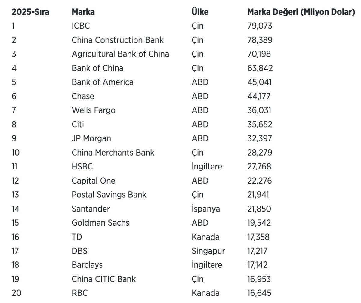 Buna göre, Çinli bankalar dünyanın en değerli markaları arasında ilk 4’te yer aldı. Çinli ICBC, yaklaşık 79,1 milyar dolarlık marka değeriyle bu yıl da zirvedeki yerini korurken ikinci sırayı 78,4 milyar dolarlık değeriyle China Construction Bank aldı.