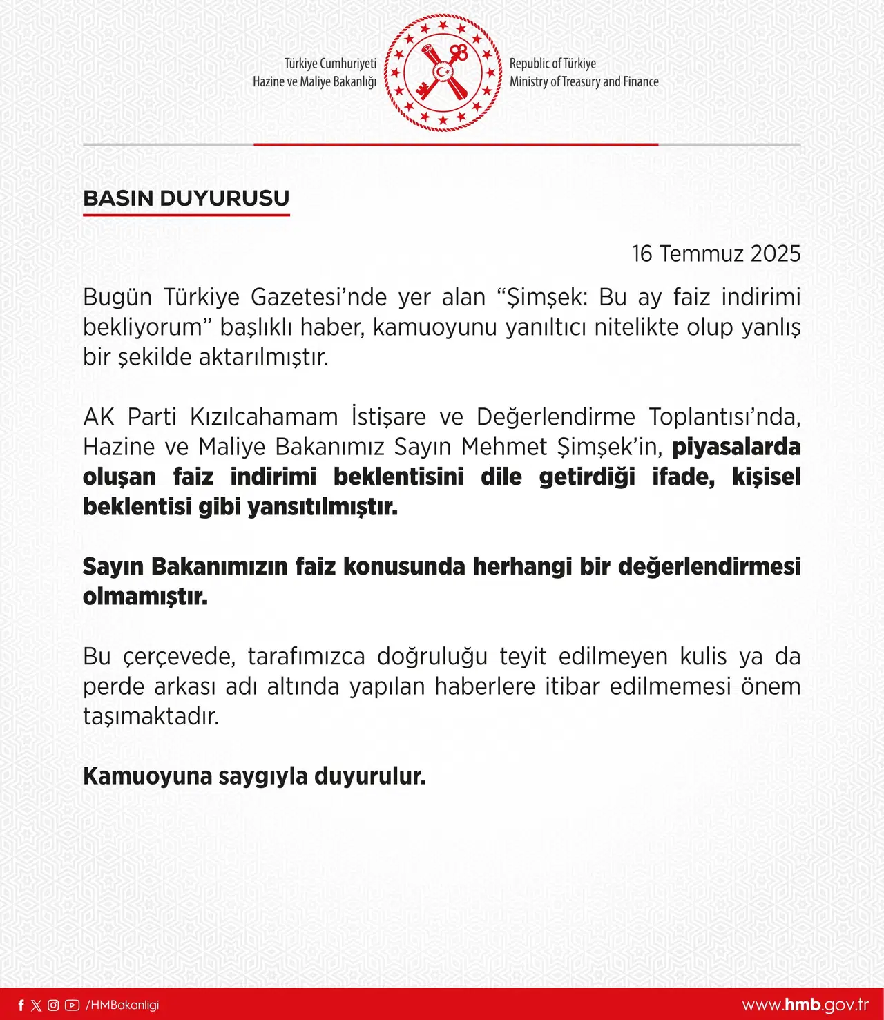 Hazine ve Maliye Bakanlığı, iktidara yakın kimliği ile bilinen Türkiye gazetesinde yer alan, “Gözler 24 Temmuz’daki PPK toplantısında… Şimşek: Bu ay faiz indirimi bekliyorum” başlıklı haberini yalanladı.