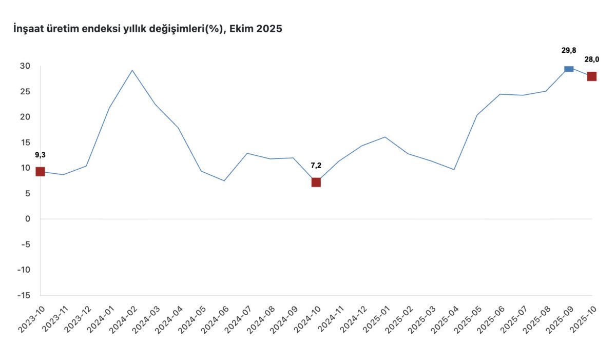 İnşaatın alt sektörleri incelendiğinde endeksin, ekimde geçen yılın aynı ayına kıyasla bina inşaatı sektöründe yüzde 28,8, bina dışı yapıların inşaatında yüzde 21,8 ve özel inşaat faaliyetlerinde yüzde 29,9 yükseldiği görüldü.