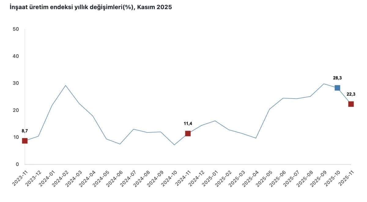 İnşaatın alt sektörleri, 2025 yılı Kasım ayında bina inşaatı sektörü endeksi bir önceki yılın aynı ayına göre yüzde 23,4 arttı.
