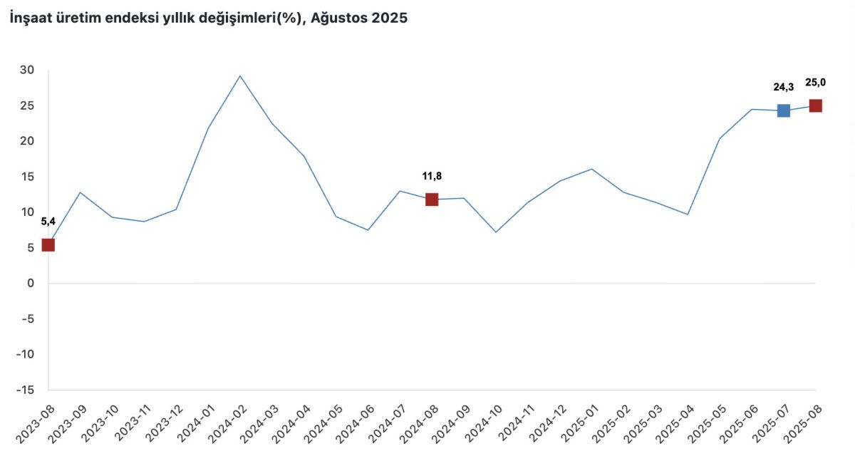 İnşaatın alt sektörleri incelendiğinde, 2025 yılı Ağustos ayında bina inşaatı sektörü endeksi bir önceki yılın aynı ayına göre yüzde 26,6 arttı, bina dışı yapıların inşaatı sektörü endeksi yüzde 17,4 arttı ve özel inşaat faaliyetleri sektörü endeksi yüzde 25,1 arttı.