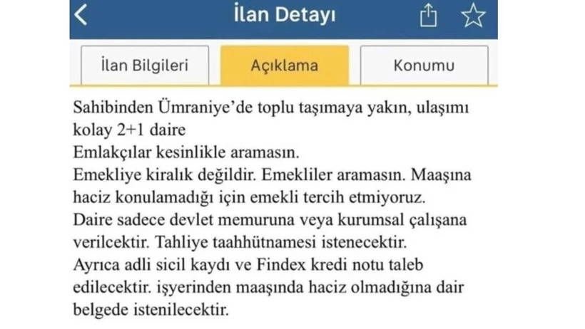 Ümraniye’deki iki artı bir kiralık dairee ilanında ”Emekliye kiralık değildir. Emekliler aramasın” ifadeleri kullanıldığı görüldü.