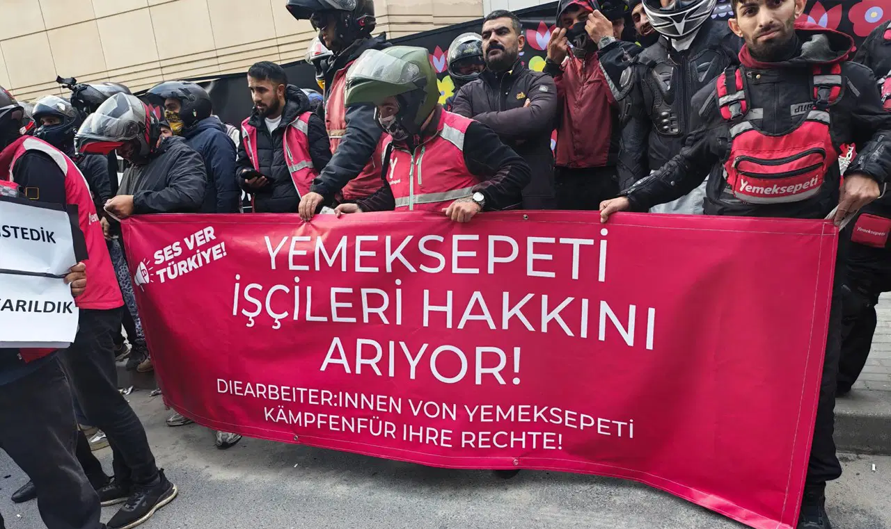Yemek Sepeti işçisi kuryeler, çalışma koşullarının iyileştirilmesi talebiyle şirketin İstanbul Şişli’deki merkez ofisi önünde eylem yaptı.