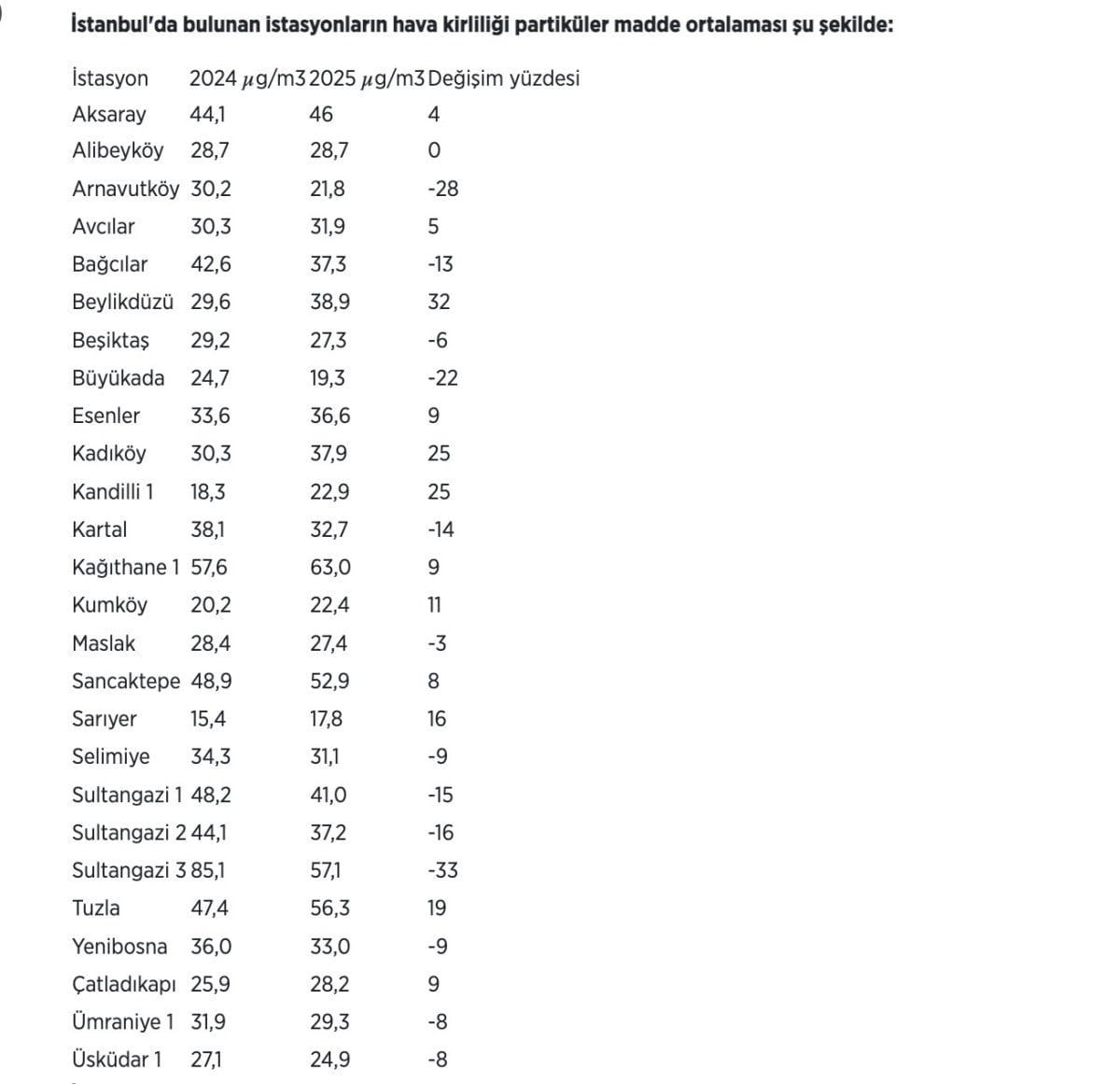 Aynı dönemde hava kirliliğinin en düşük ölçüldüğü istasyon, metreküp başına 17,8 mikrogramla Sarıyer İstasyonu oldu. Partikül madde kirliliği Büyükada İstasyonu’nda 19,3 mikrogram, Arnavutköy İstasyonu’nda 21,8 mikrogram olarak belirlendi.