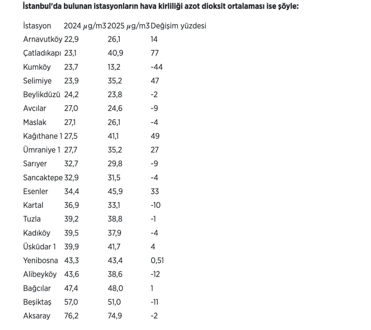 İstanbul’da 2025’te azot dioksit hava kirliliğinin en fazla ölçüldüğü istasyon, metreküp başına 74,9 mikrogramla Aksaray oldu. Aksaray İstasyonu’nu 51 mikrogramla Beşiktaş ve 48 mikrogramla Bağcılar takip etti.
