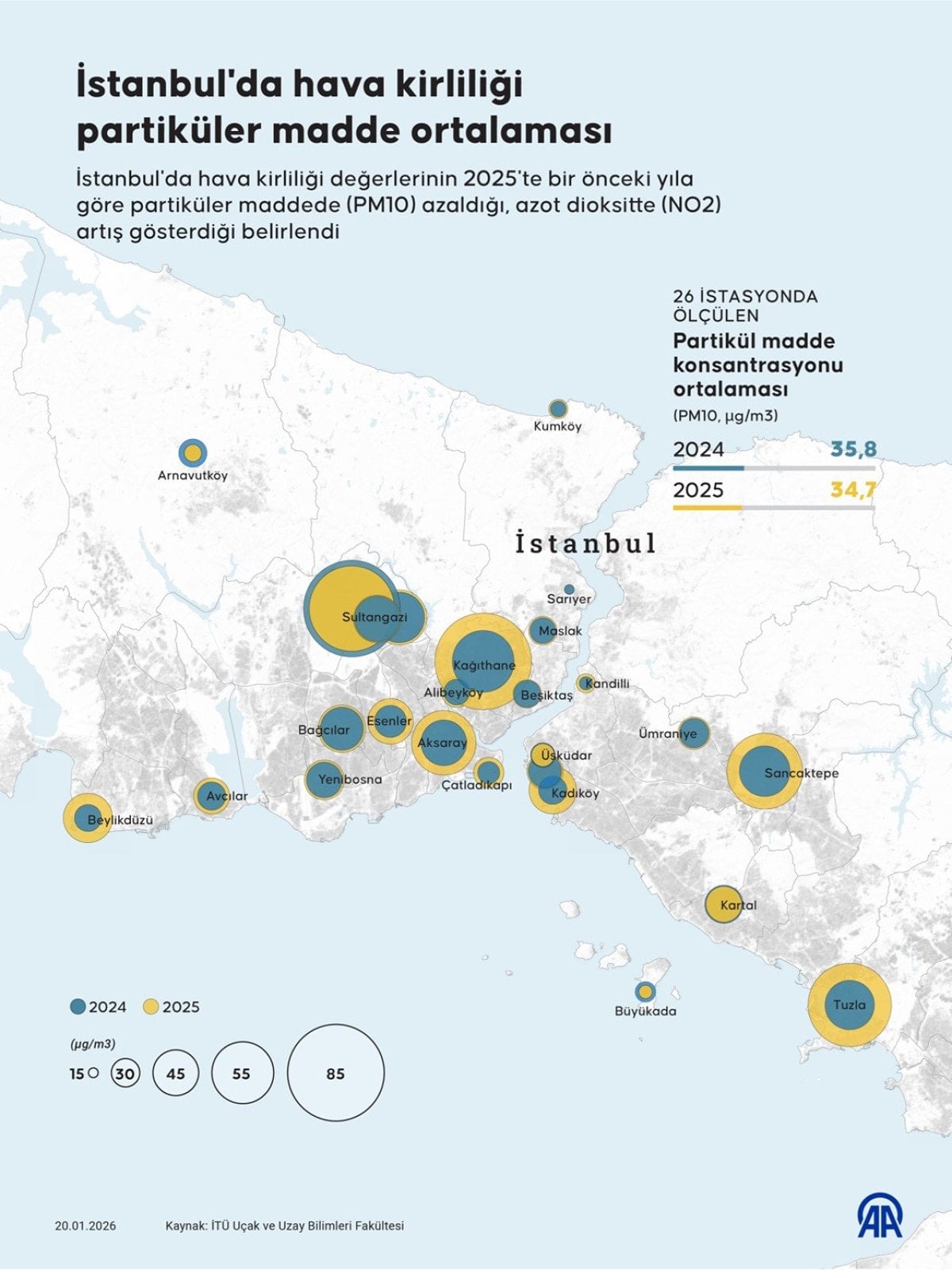 İstanbul Teknik Üniversitesi (İTÜ) bünyesinde yapılan çalışmada, İstanbul’da hava kirliliği değerlerinin 2025’te bir önceki yıla göre partiküler maddede (PM10) azaldığı, azot dioksitte (NO2) artış gösterdiği belirlendi.