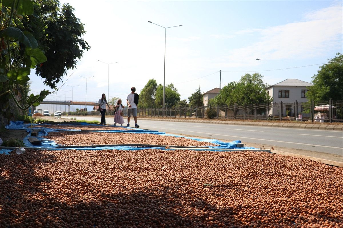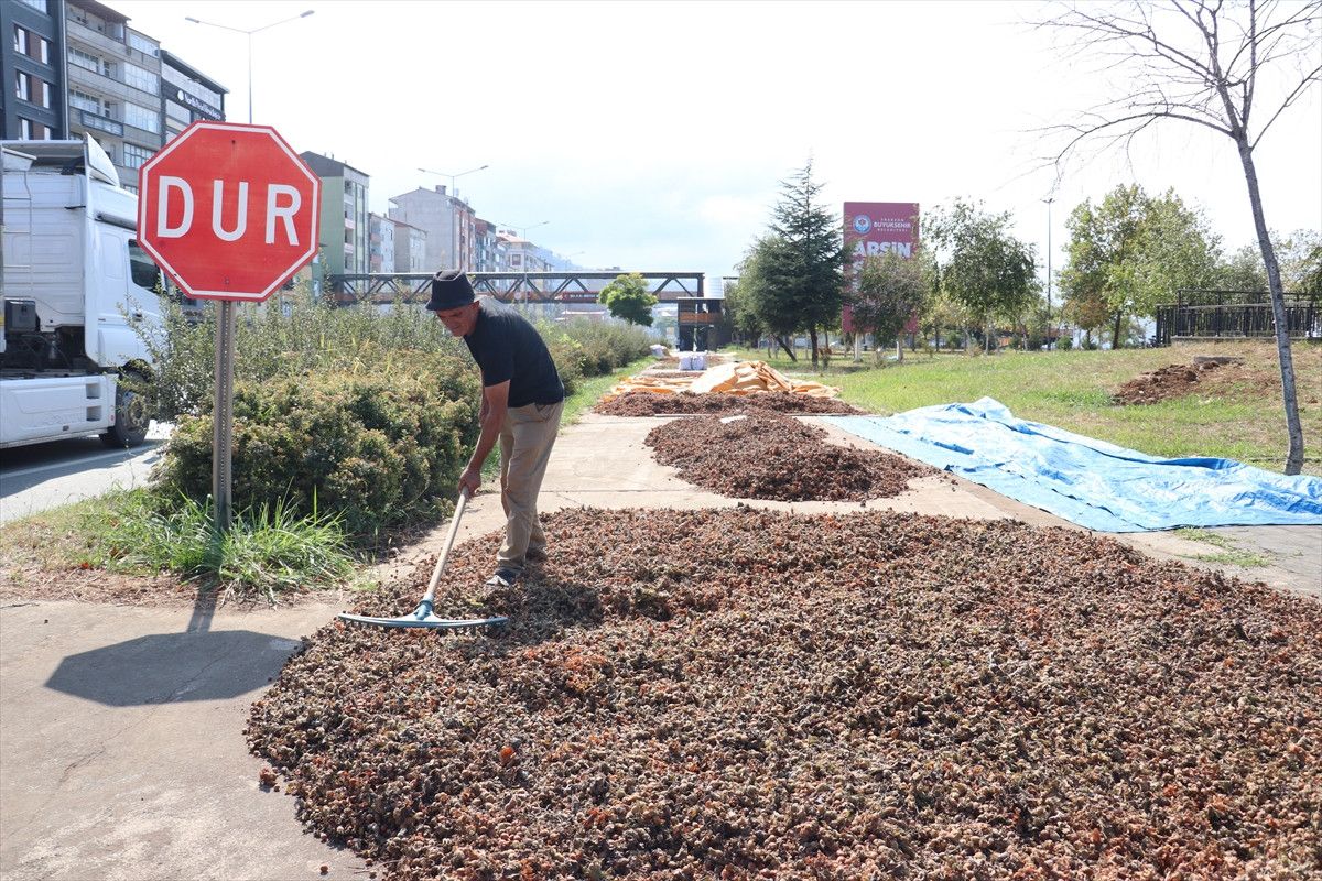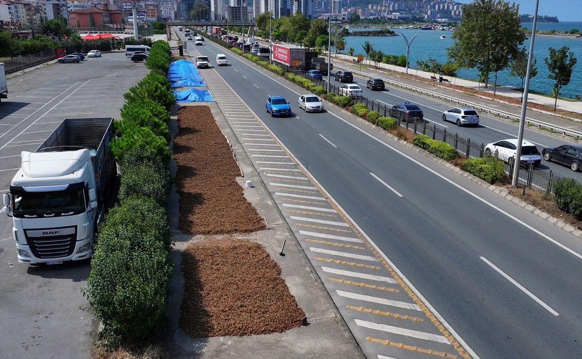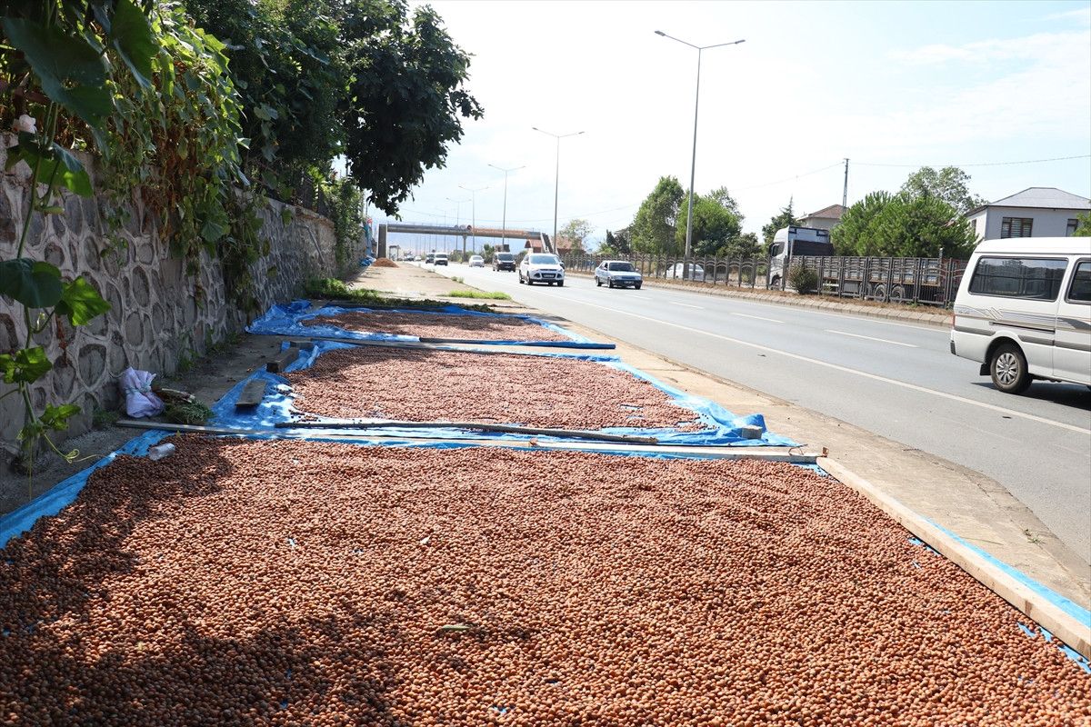 Trabzon’da hasat sonrası çuvallarla topladıkları ürünlerini kurutmak zorunda olan bazı üreticiler, düz bir zemin arayışına Karadeniz Sahil Yolu’ndaki kaldırımlarda çözüm buldu.
