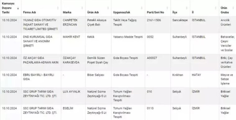 Tarım ve Orman Bakanlığı, son yaptığı testlerde kekikte yabancı madde, salça yerine boya satıldığını ortaya çıkardı. Ayrıca zeytinyağlarında yine tohum yağları çıktı. Son yapılan testlerde tağşiş-taklit yapılan salça, bal, zeytinyağı ve kekikler ürünlerinin listesi yayımlandı.